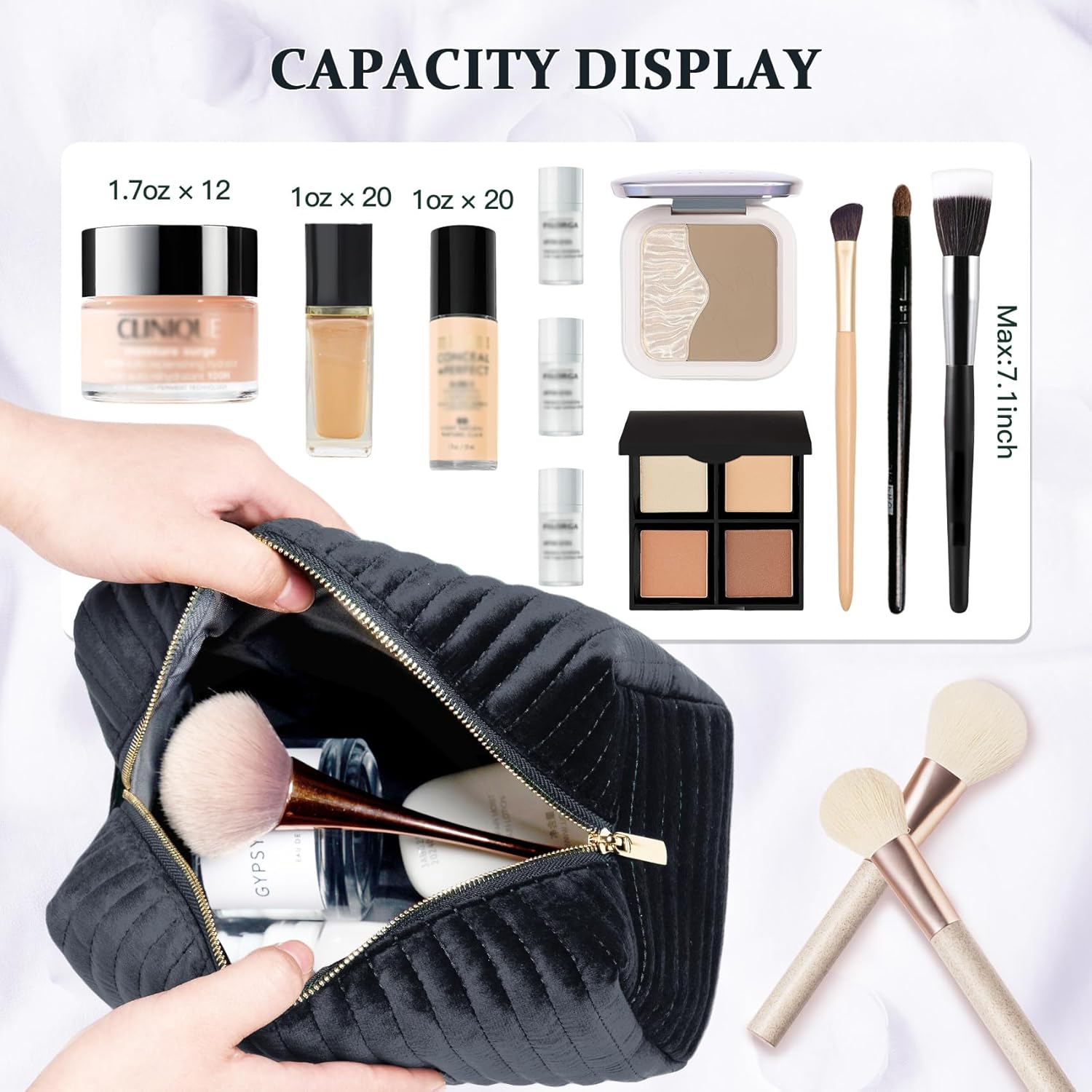 - [Soft Sturdy Polyester Velvet Make Up Bag with Compartments] The velvet cosmetic pouch made from high quality polyester and made with three inner pockets, well protect and organize eyebrow eyeshadow brushes eyeliner lipstick glossier lip balm lipgloss liner oil tint stain.